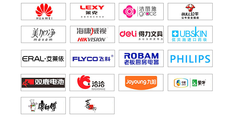 莱克,得力文具,九阳集团,华为手机,洁丽雅毛巾,广博文具,晨光文具,美的集团,正泰电器,科沃斯机器人,蒙牛,肯德基,公牛,老板电器,海康威视,艾莱依,隆力奇公司,飞利浦,贝因美,姚生记食品,哈尔斯集团,康师傅,喜之郎,双鹿电池,飞科集团,超人集团,上海美加净日化,红叶制伞,波力海苔,双汇集团,面膜小屋等等。